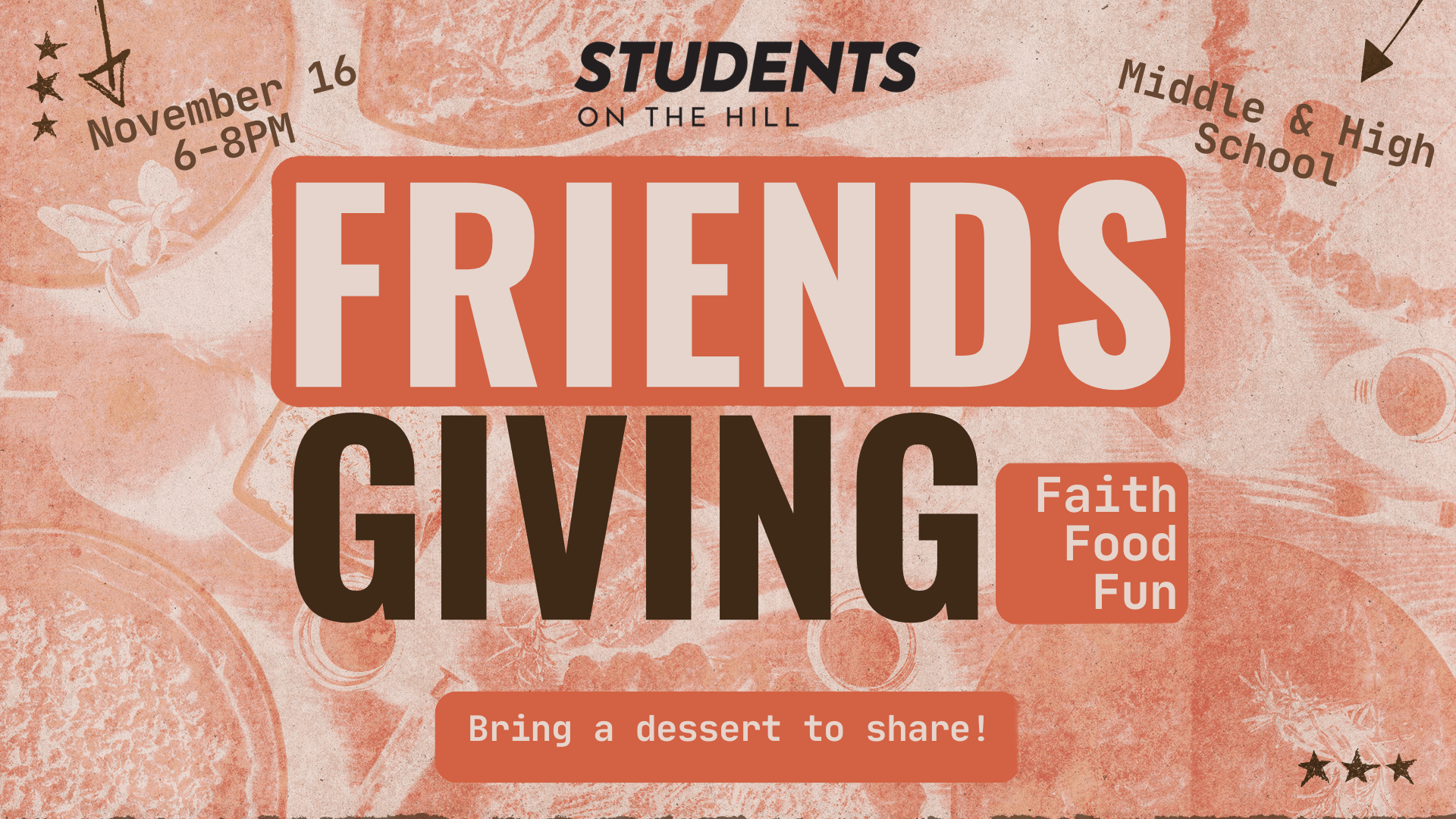 Middle School & High School students, join us for an evening of Faith, Food, and Fun memories at our Friendsgiving celebration on Sunday, November 16th from 6:00–8:00 p.m. Bring a dessert to share, and come ready for laughter, games, and connection with friends old and new!
