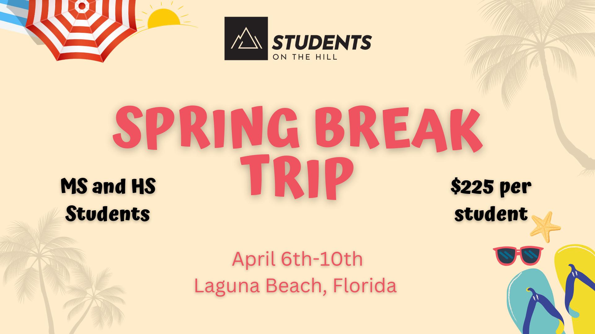 This spring break, our students are heading to the beach from April 6-10 for a meaningful, Jesus-filled getaway in Laguna Beach, FL. Alongside students from several other churches, they’ll worship together, hear God’s Word, build friendships in small groups, and grow in their faith—all in a safe, welcoming environment where every student is known and loved. This trip has been life-changing for generations (including our own leaders!) and continues to be a powerful space for students to take next steps in following Jesus. We believe this week will mark a meaningful moment in your student’s spiritual journey—right here, right now. CLICK HERE to register.