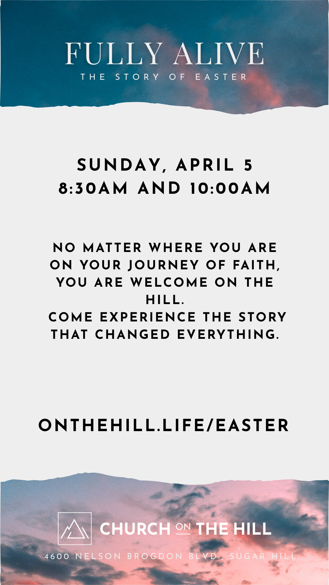 We will gather to hear the story of Easter and learn that the resurrection isn’t just an event to remember, but a reality that brings new life to us today. When Jesus walked out of the tomb, He made a way for us to experience forgiveness, freedom, purpose, and a future filled with His resurrecting power.